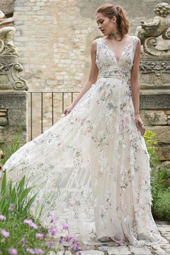 Promfast A Line V neck 3D Floral Lace Long Prom Dresses Evening Dresses PFP2141