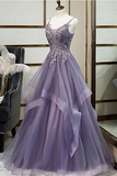 Promfast A line V neck Purple Tulle Spaghetti Straps Prom Dress With Lace Appliques PFP2010