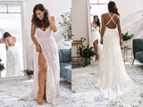 Promfast Elegant A Line V Neck Lace Ivory Beach Wedding Dresses with Slit, Bridal Gowns PFW0585