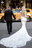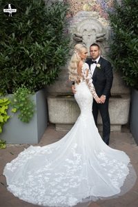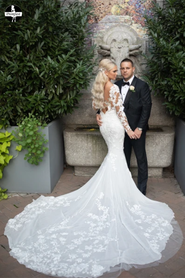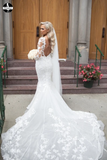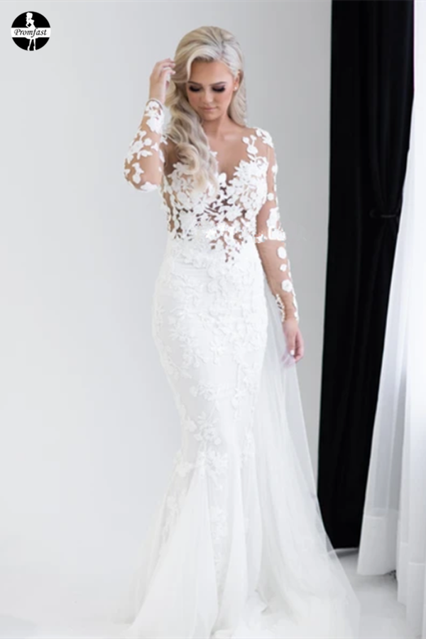Promfast Long Sleeve Elegant Lace Mermaid Tulle Wedding Dresses for Sale PFW0488