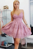 Promfast Pink Tulle A line V neck Lace Spaghetti Straps Short Homecoming Dresses PFH0394