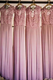 Round Neck A Line Cap Sleeves Chiffon Long Bridesmaid Dress with Lace PFB0021