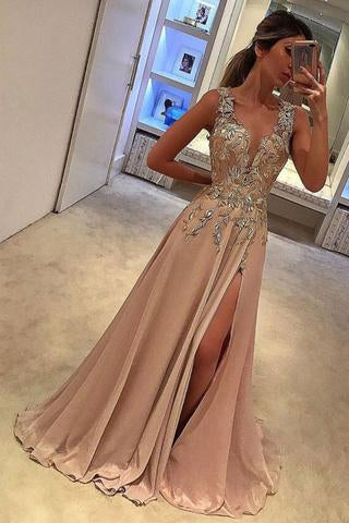 Sexy V Neck Split Side,Appliques A Line Long Prom Dress PFP0424