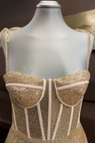 Shiny A Line Spaghetti Straps Gold Prom Dresses Long, Sweetheart Neck Golden Formal Dress PFP2385