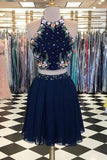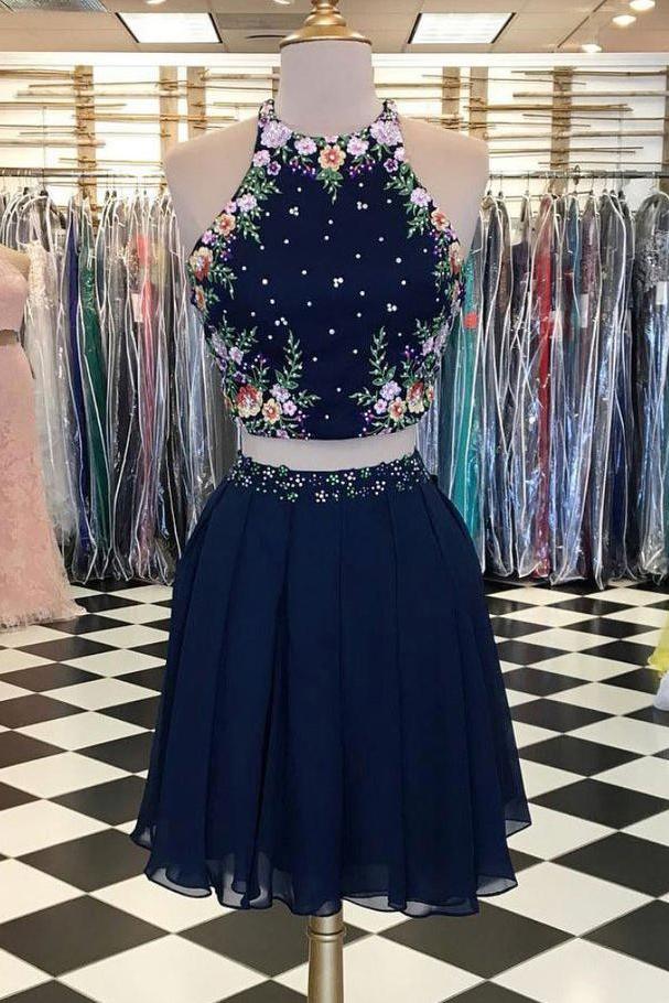 Two Pieces Dark Navy Scoop Floral Elegant Short Prom Dresses,Homecoming Dress PFH0042