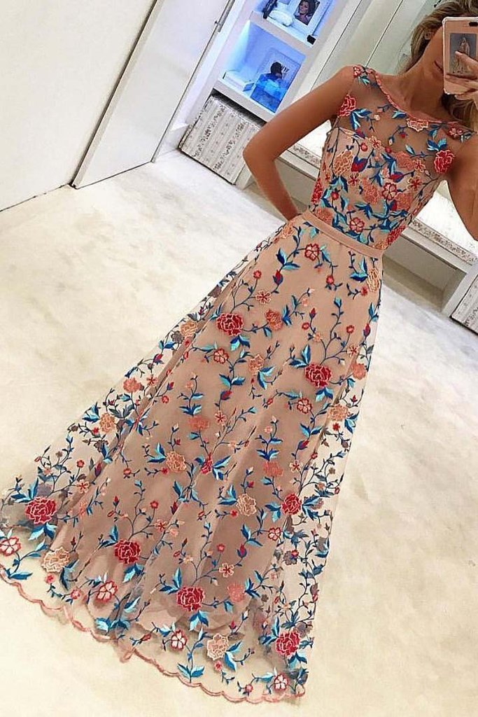 Unique Floral Embroidery Long A Line Prom Dress Evening Dress PFP0338