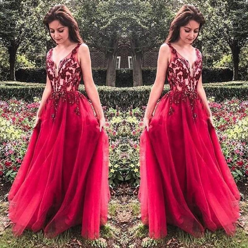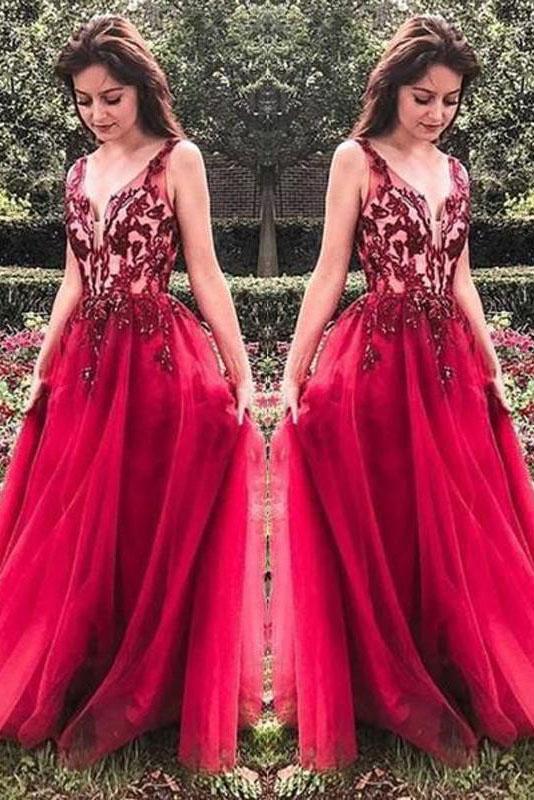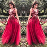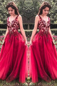 Unique Red V Neck Tulle Appliques Prom Dresses, Long Party Gowns PFP0724