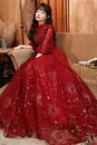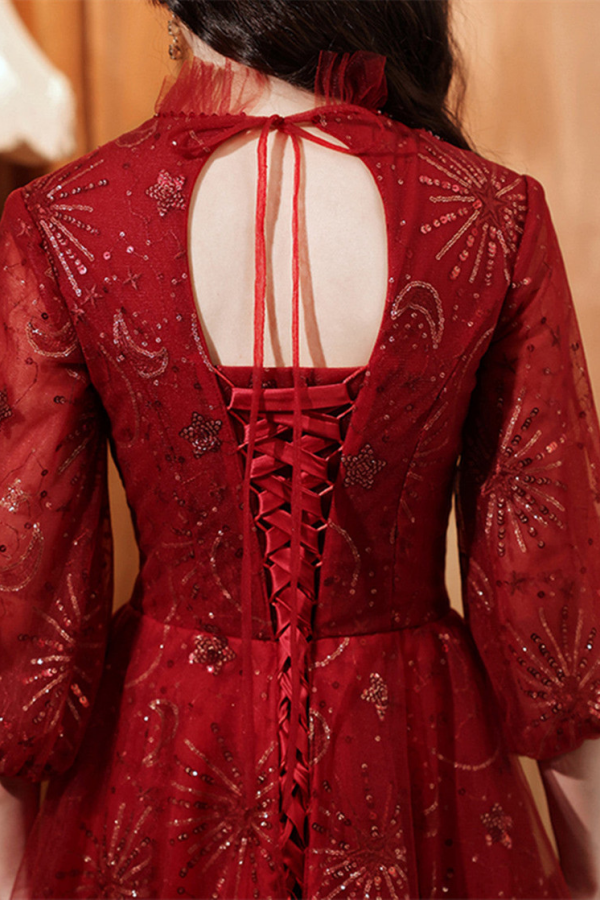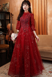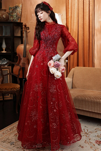 Wine Red Tulle Puffy Sleeves Long Party Dress, Wine Red Long Prom Dress PFP2522