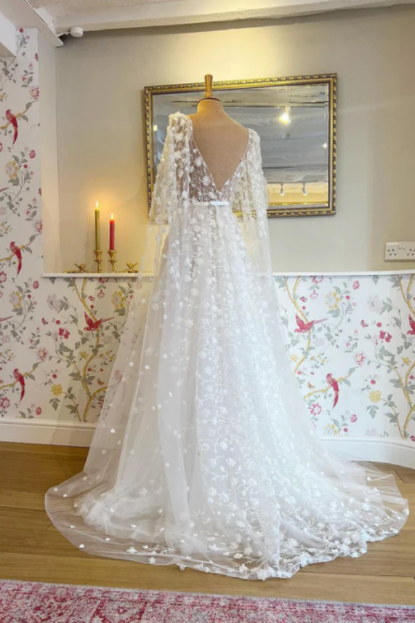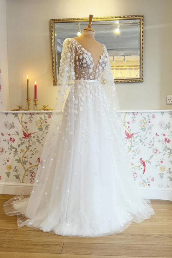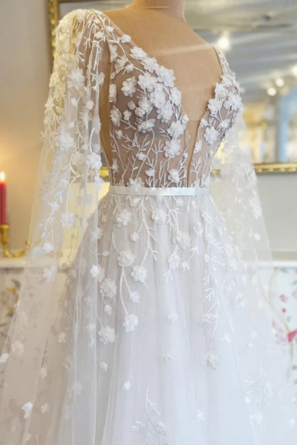 3D Flowers See Through Bodice Bridal Gown V Neck Wedding Dress with Detachable Sleeves PFW0638
