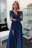 A Line Long Sleeves V Neck Dark Blue Prom Dresses With Appliques PFP0598