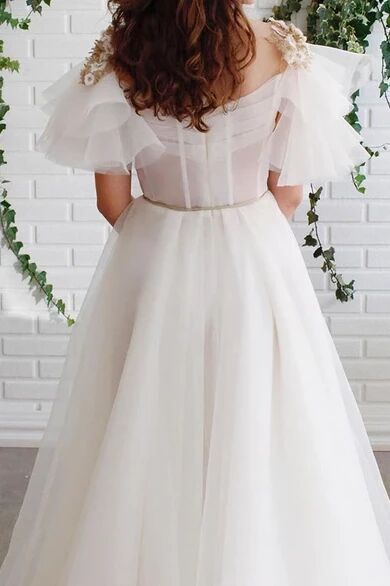 A-line Off White Short Sleeves Long Prom Dresses Organza Evening Dress PFP1723