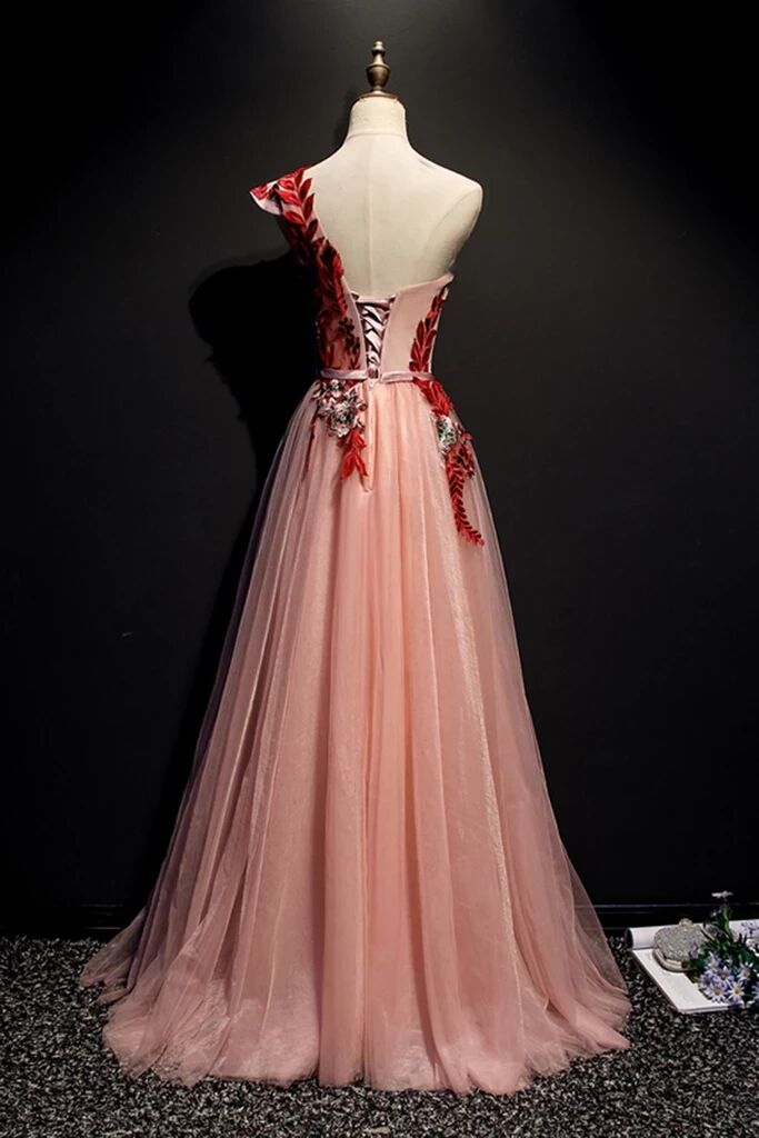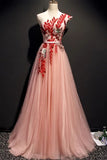 A Line Pink One Shoulder Tulle Red Applique Long Prom Dress Evening Dress PFP1680