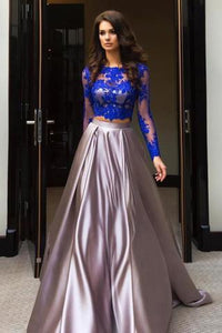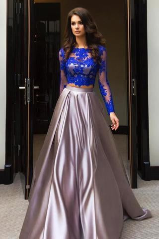A Line Royal Blue Two Piece Long Sleeve Lace Top Prom Dresses PFP0859