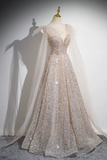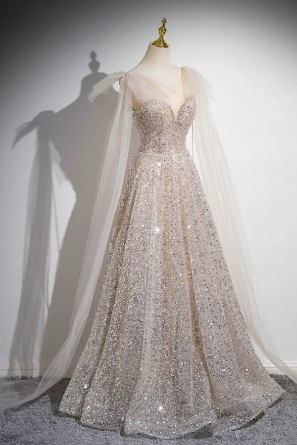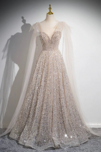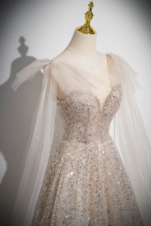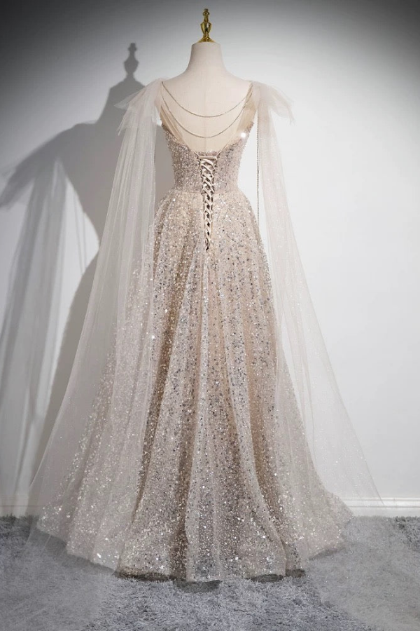 A Line Scoop Neckline Tulle Sequin Champagne Long Prom Dress PFP2656