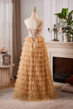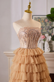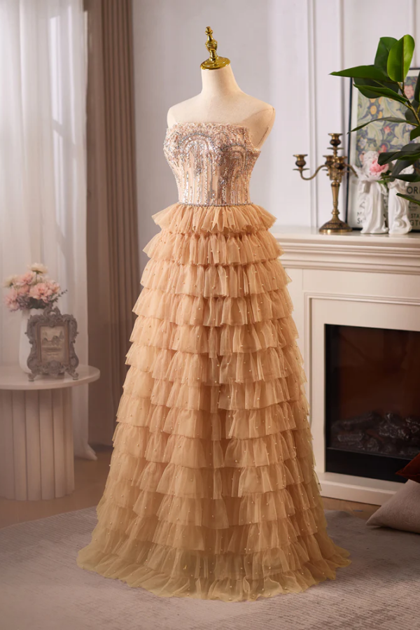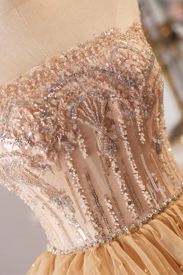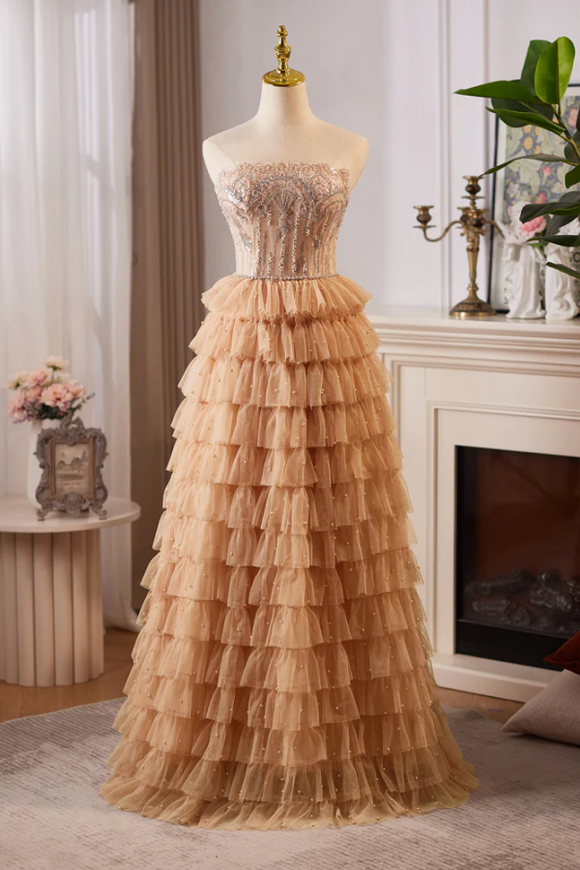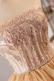 A Line Tulle Lace Champagne Long Prom Dress With Beads PFP2722