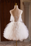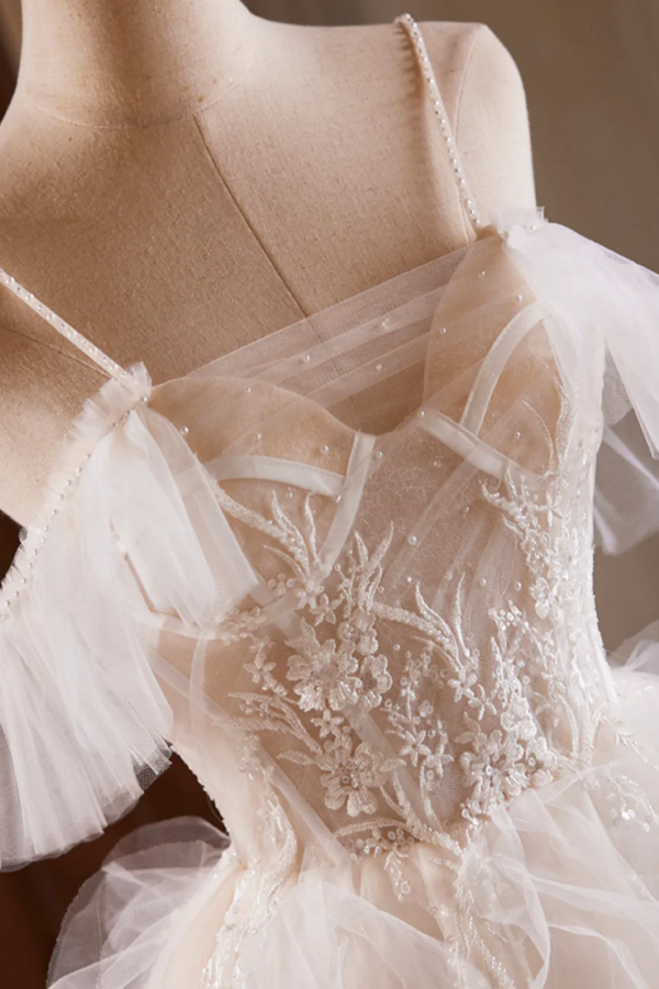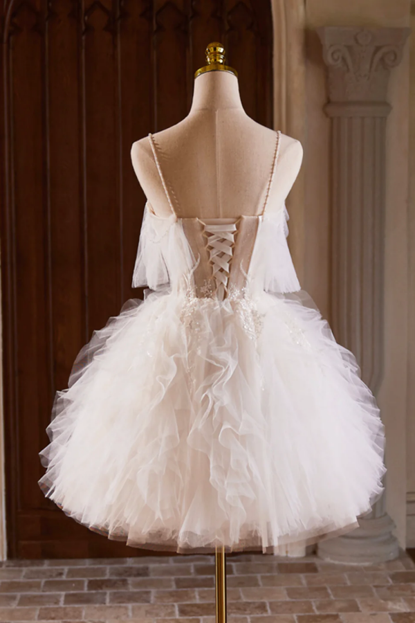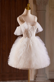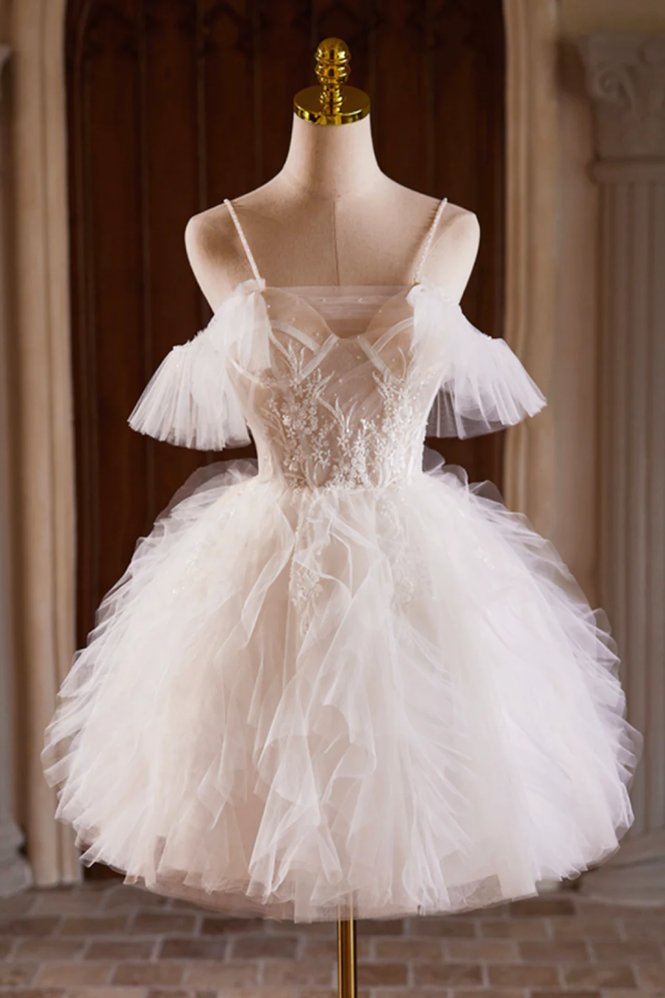 A Line Tulle Layers Short Prom Dress, Light Champagne Spaghetti Strap Party Dress PFH0452