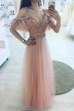 A-Line V-Neck Off Shoulder Pink Tulle Long Prom Dress with Beading PFP0091