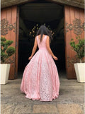 A-Line V-Neck Sweep Train Pink Lace Prom Dress with Split PFP1531