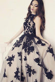 Appliques A-Line Round Neck Black Lace Long Prom Dress PFP1006