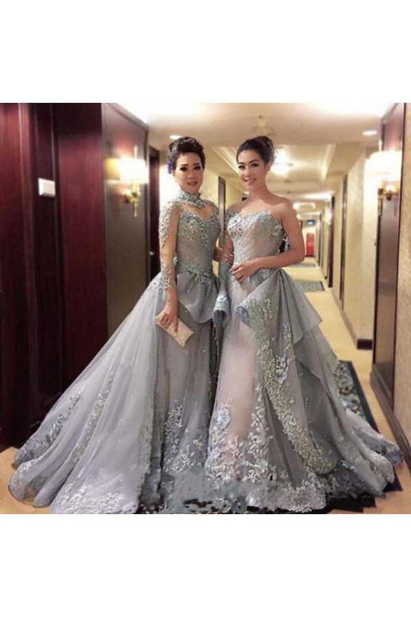 Ball Gown Princess Long Sleeves Tulle Gray Long Formal Prom Dress PFP0428