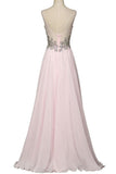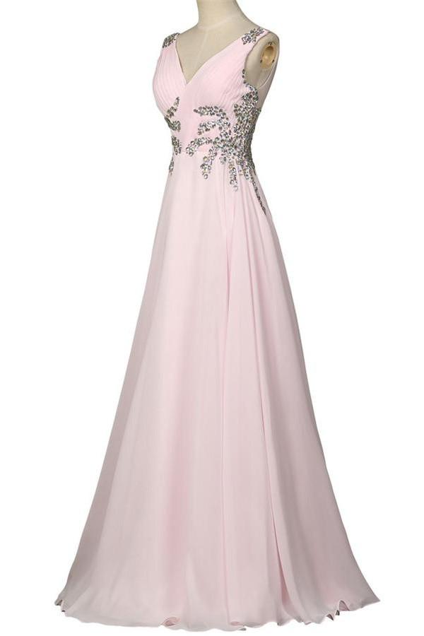 Beautiful Girly Chiffon Long Beading Pink V-neck Backless Prom Dresses PFP1051