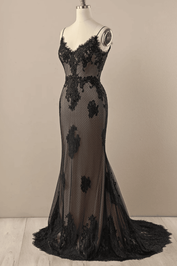 Black V neck Beaded Lace Evening dress, Lace Mermaid Prom Dress PFP2506