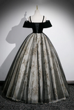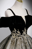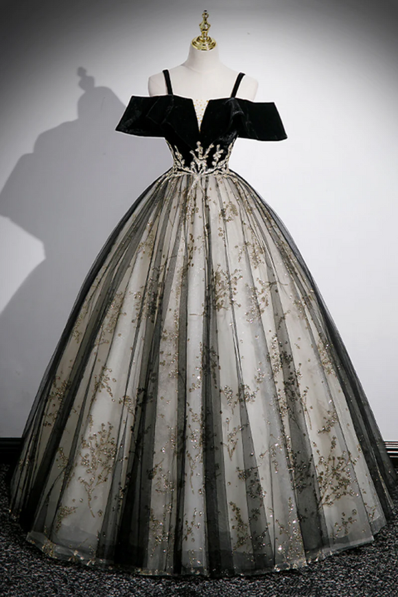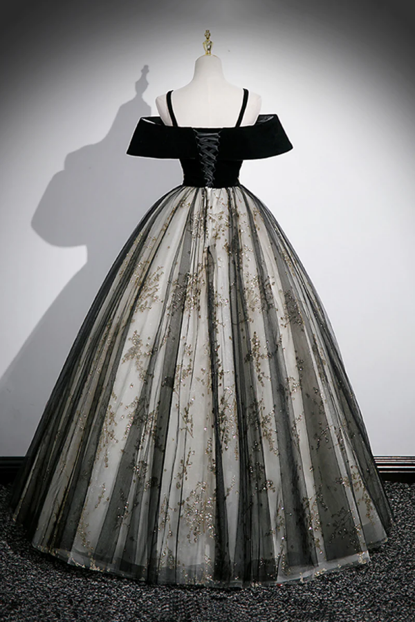Black Velvet and Sequins Long Prom Dress, Black Off the Shoulder A Line Evening Dress PFP2474