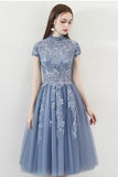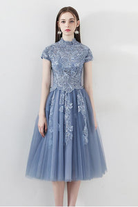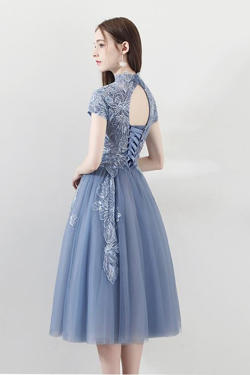 Blue A Line Tulle Cap Sleeves High Neck Homecoming Dresses With Lace Appliques PFH0148