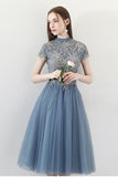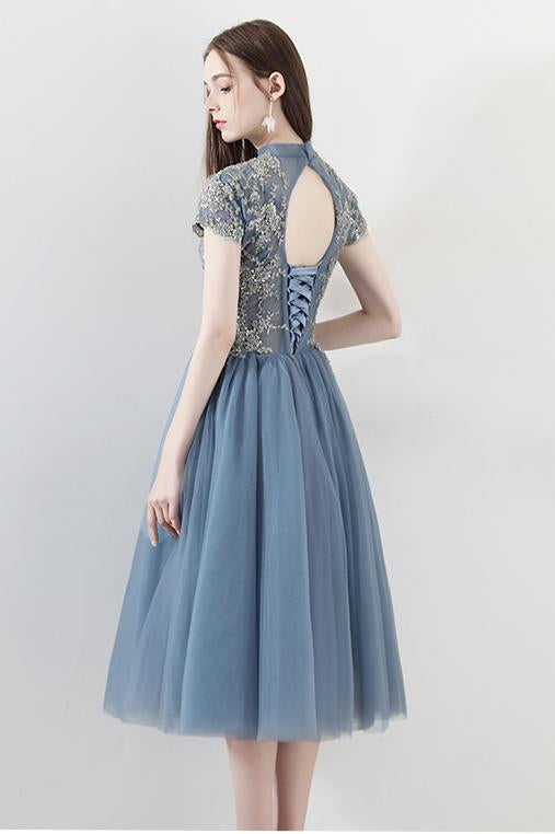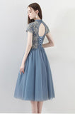 Blue A Line Tulle Short Sleeves High Neck Appliques Homecoming Dresses PFH0149