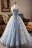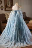 Blue Tulle Printed Pattern Long Prom Dress, Beautiful A Line Party Dress with Cape PFP2820