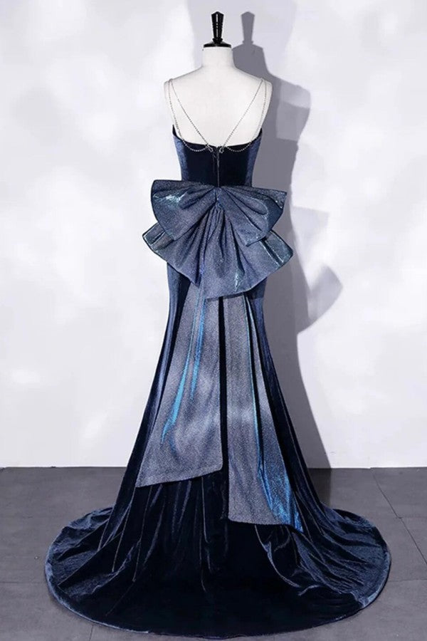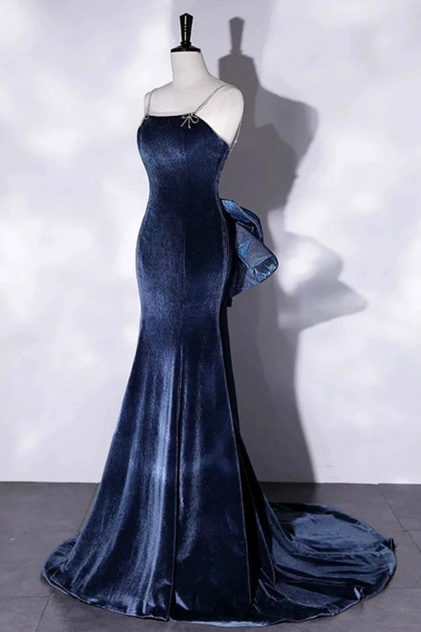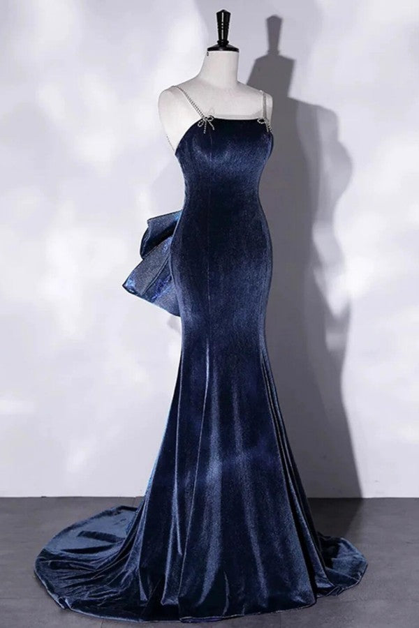 Blue Velvet Spaghetti Strap Long Prom Dress, Mermaid Bow Evening Party Dress PFP2660