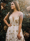 Cap Sleeve A Line Long Lace Prom Dresses With Gold Stars PFP0692
