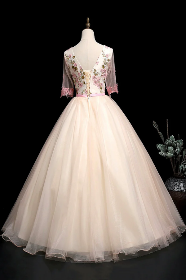 Champagne V Neck Lace Long Prom Dress, A Line 1/2 Sleeves Evening Party Dress PFP2509