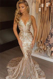 Charming Mermaid Trumpet Deep V Neck Sleeveless Sparkle Long Prom Dresses PFP0176