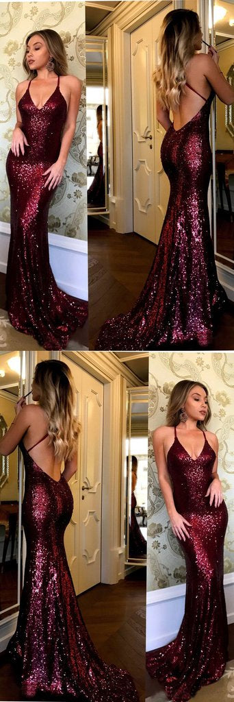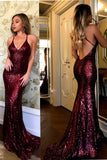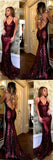 Charming Spaghetti Strap V-neck Burgundy Sequins Long Sexy Mermaid Prom Dresses PFP0203