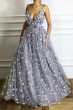Deep V-Neck Long Flowers Lace Grey Prom Evening Dress A-Line Formal Dresses PFP0037