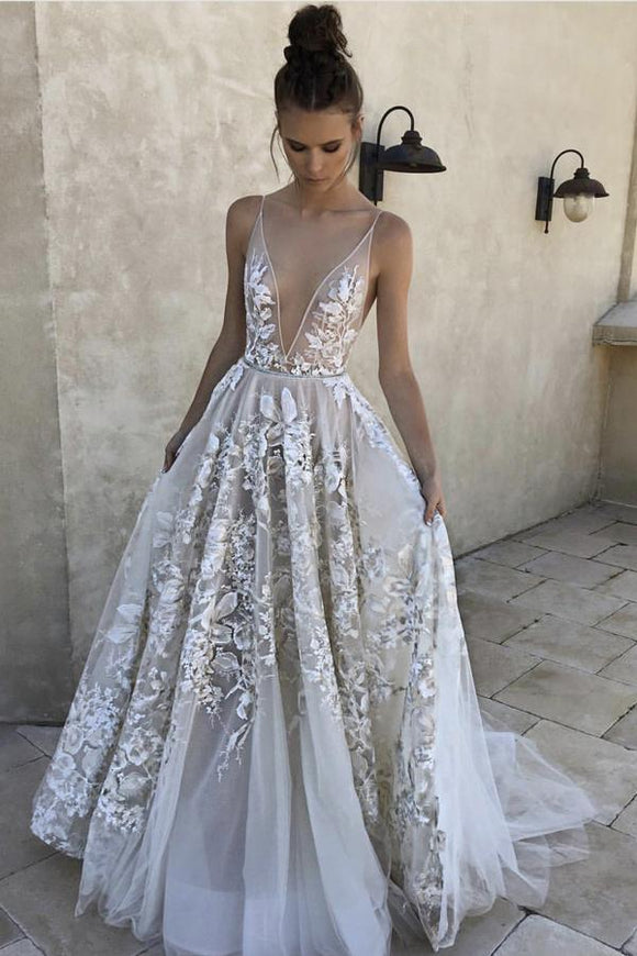 Elegant A Line Deep V-Neck Ivory Tulle Long Prom Dress with Lace Appliques PFW0312