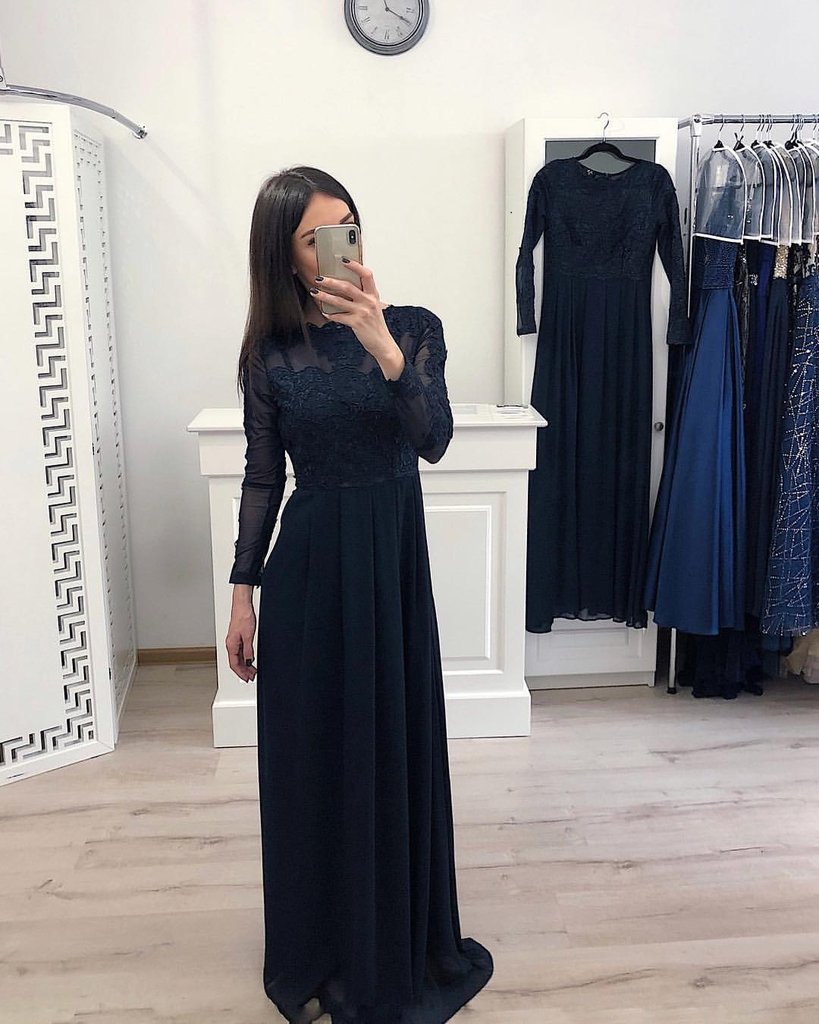 Elegant A Line Long Sleeve Chiffon Navy Blue Appliques Prom Dresses PFP0680