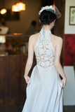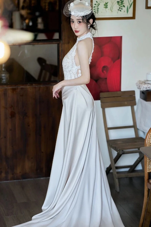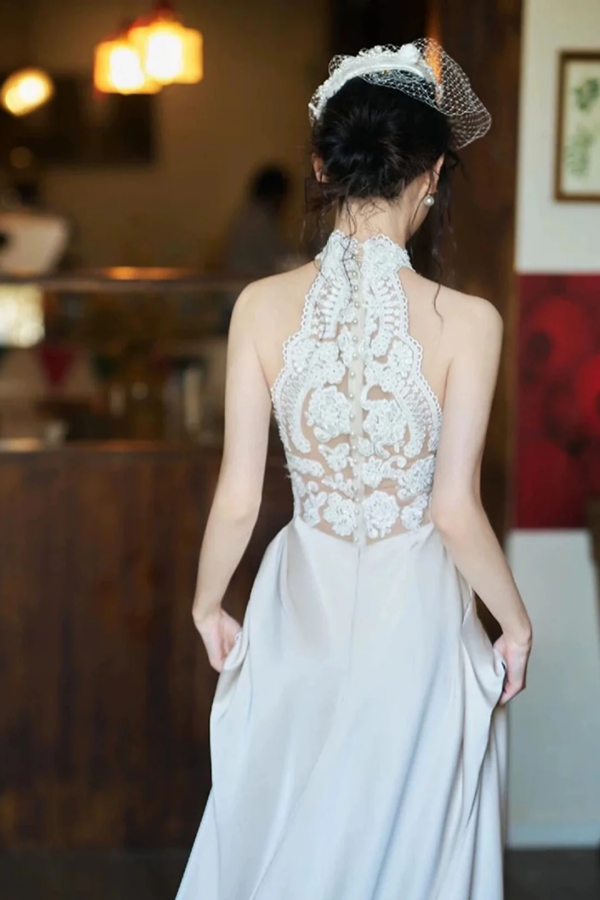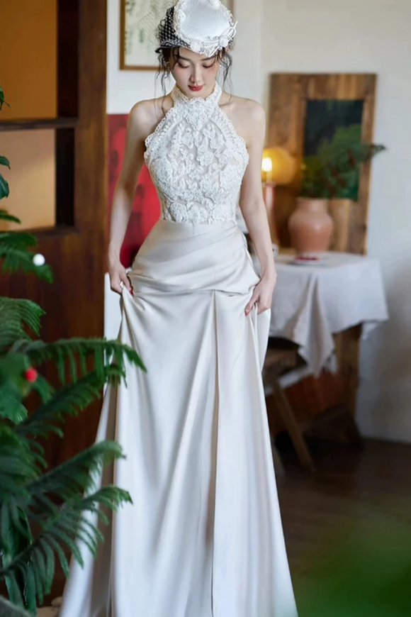 Elegant Lace and Satin Halter Long Wedding Party Dress, Long Formal Gowns PFP2699
