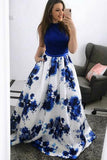 Fashion A-Line Jewel Blue Floral Long Prom Dress with Pockets PFP0513