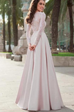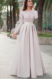 Lace Top Satin Jewel Neckline Long Sleeves A-line Prom Dress Evening Dress PFP0366