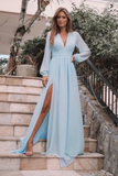 Light Blue Long Sleeves V Neck Chiffon Side Slit Prom Dresses PFP2414