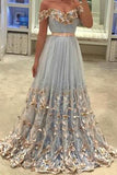 Light Blue Tulle Off The Shoulder Evening Gowns A Line Lace Appliques Prom Dress PFP0842