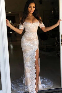 Mermaid Off-the-Shoulder Short Sleeves Pearl Pink Long Prom Dress with Appliques PFP1502