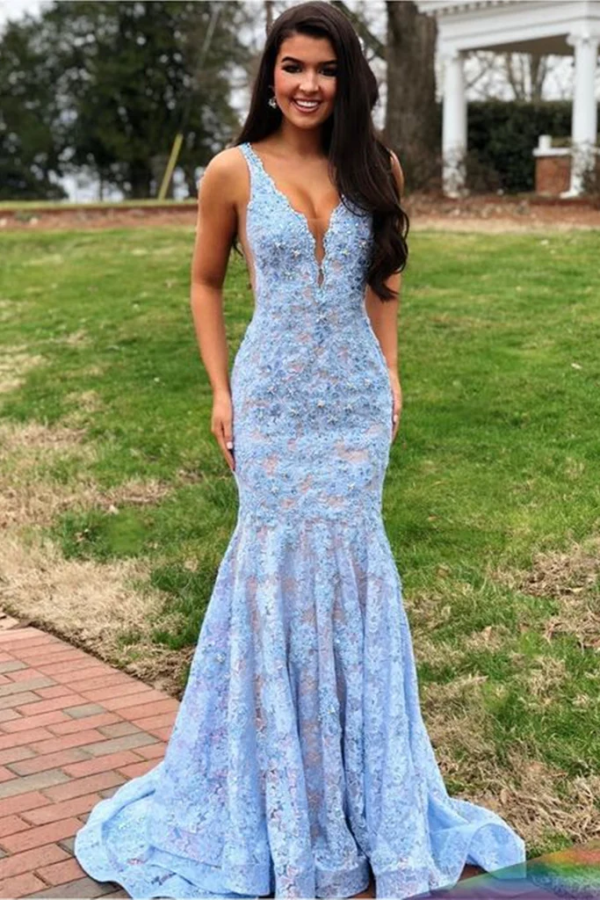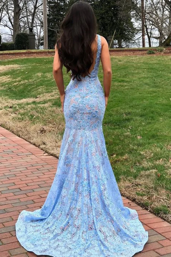 Open Back V Neck Mermaid Blue Lace Long Prom Dress, Evening Dress PFP2321