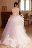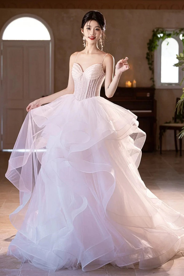 Pink and White Tulle Beaded Layers Sweet 16 Dress, Tulle Long Prom Dress PFP2703
