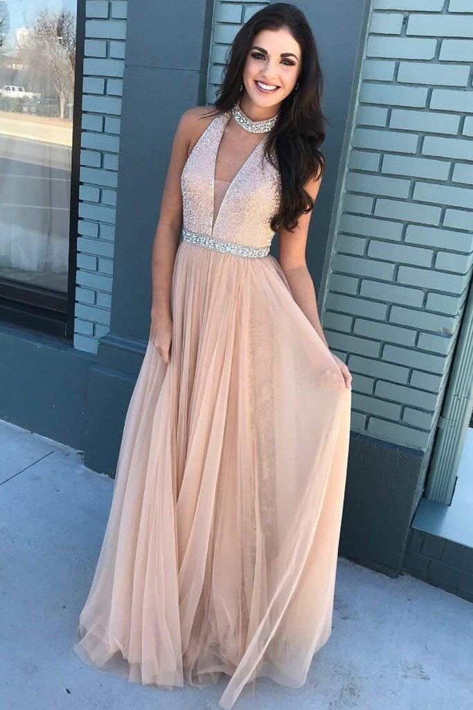 Pink Beaded Bodice High Neck Long Tulle Prom Dresses,A-Line Long Evening Dresses PFP0441