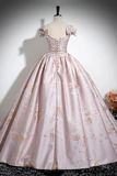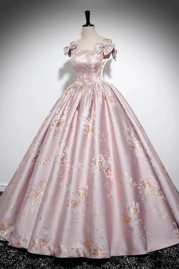 Pink Floral Satin Long Prom Dress, Beautiful A Line Evening Dress with Bow PFP2670