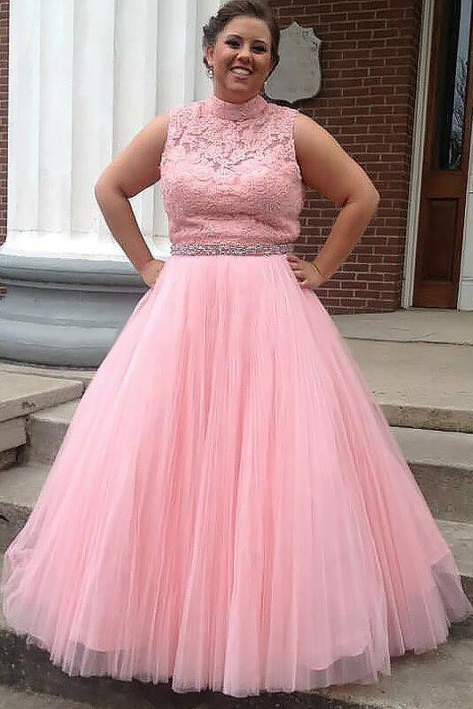 Pink Tulle High Neck Long Beading Plus Size Prom Dress With Lace Top PFP0823