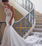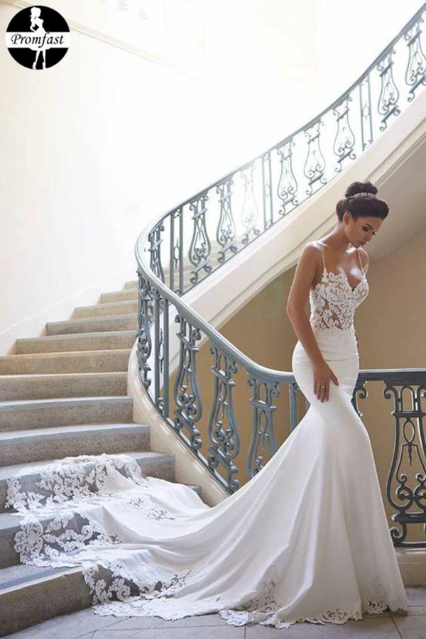 Promfast 2021 Cheap Mermaid Lace Satin Ivory Spaghetti Straps V Neck Wedding Dresses PFW0485